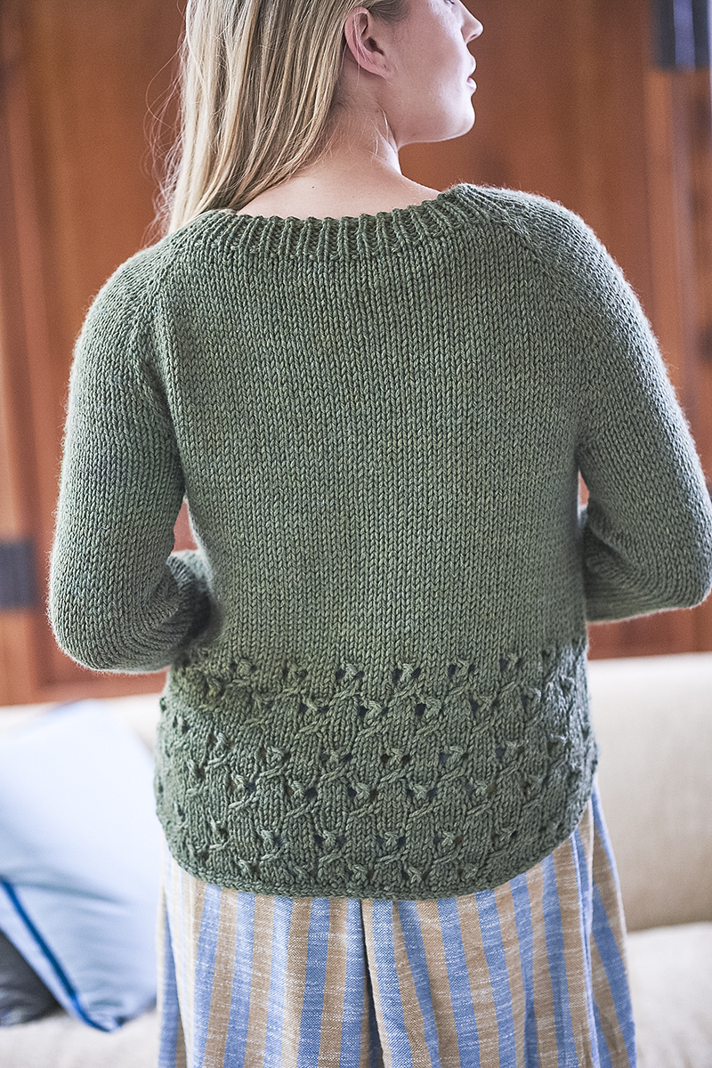 This seamless top-down beauty features raglan shaping and a curved lace hem with an I-Cord edging. This is a quick project in Berroco's Ultra Wool Chunky!
