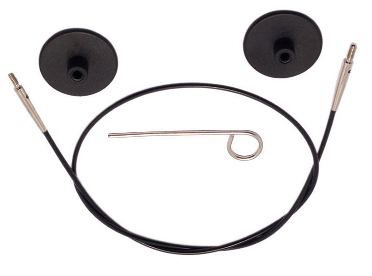 Extra! Extra! Knit all about it! Extra cables for your Knitter's Pride needles! Resilient, flexible cords that lay flat with no kink or twist. Each Knitter's Pride Cord has a smooth join that enables stitches to slide around the needles effortlessly. The long threaded screw-in join ensures that the cords and needles stay connected. There is a tightening hole provided in the metal join for extra secure tightening and the specially designed key facilitates effortless tightening. The end caps easily fit on the cord and keep your knitting safe!