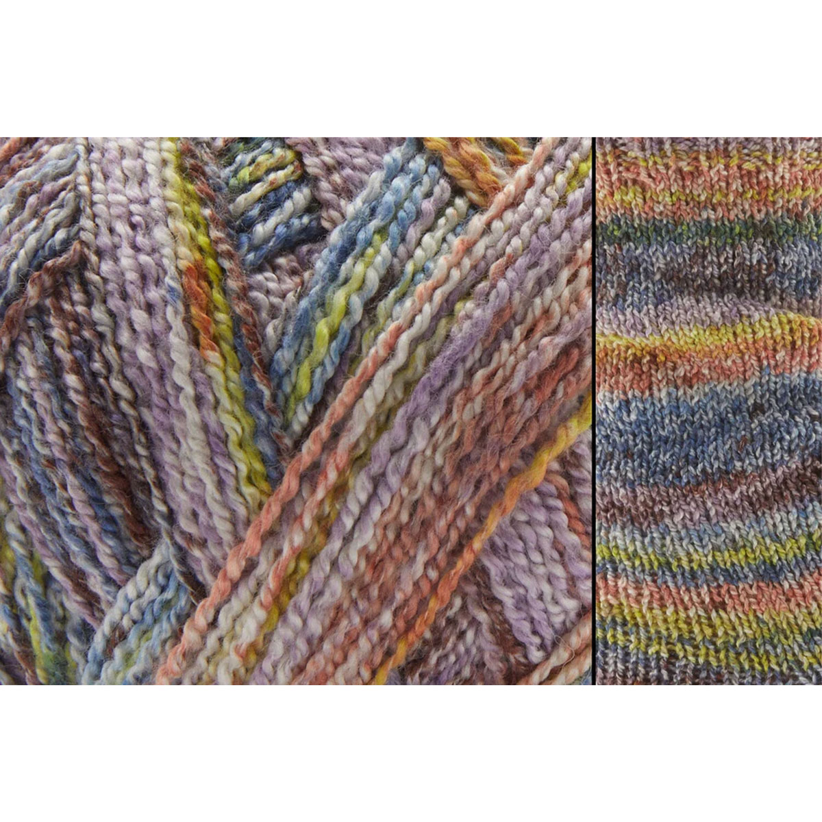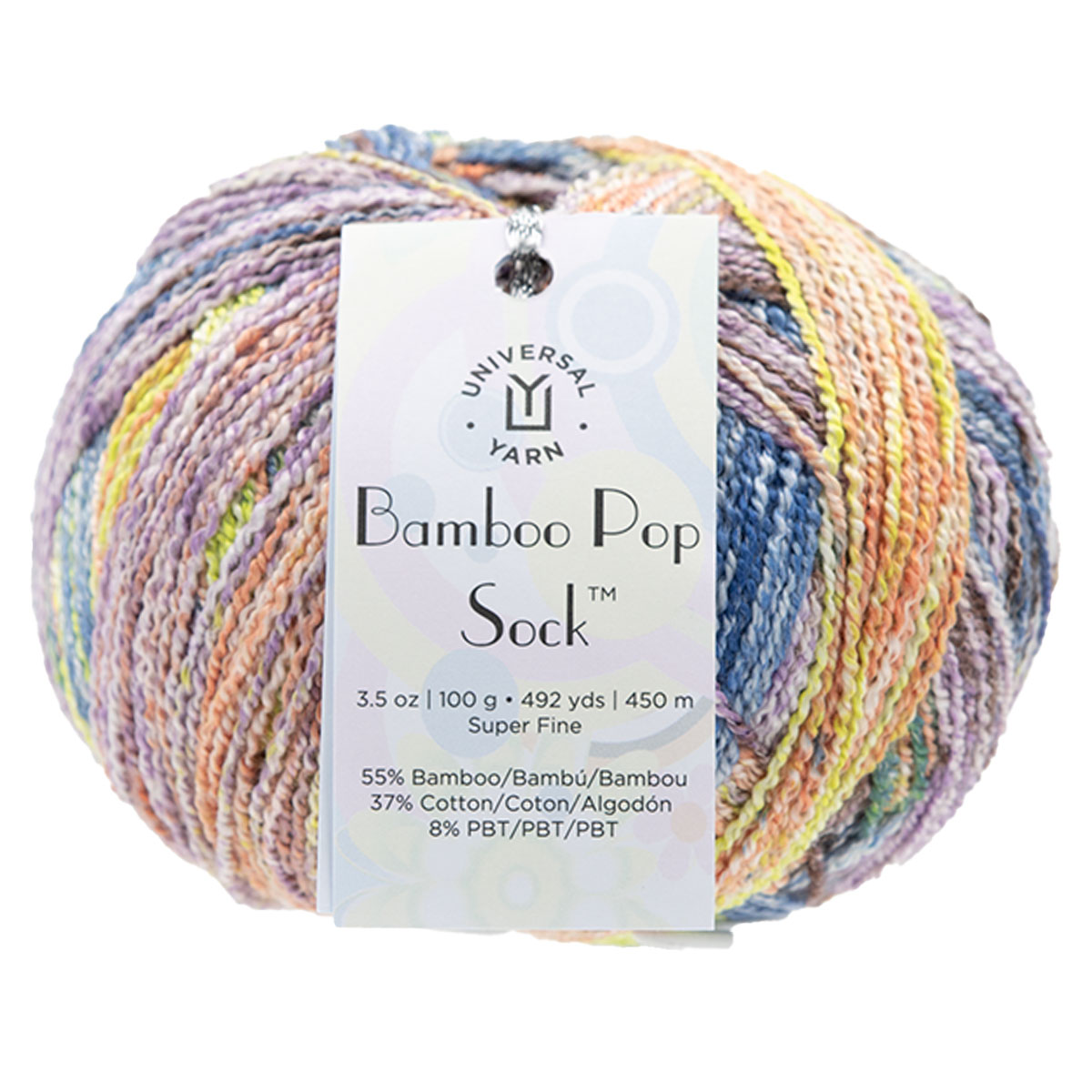 Springy and sproingy and entirely without animal fibers (specifically bamboo, cotton, and a touch of PBT), Bamboo Pop Sock is the answer for folks who are looking for a fingering-weight sock yarn for those in-between months of the year or have wool allergies! This yarn comes in a cute crazy ball put-up that also doubles as the perfect size for juggling if you happen to have a few of them! This yarn is self-striping and self-patterning, elevating even the most basic of sock patterns.