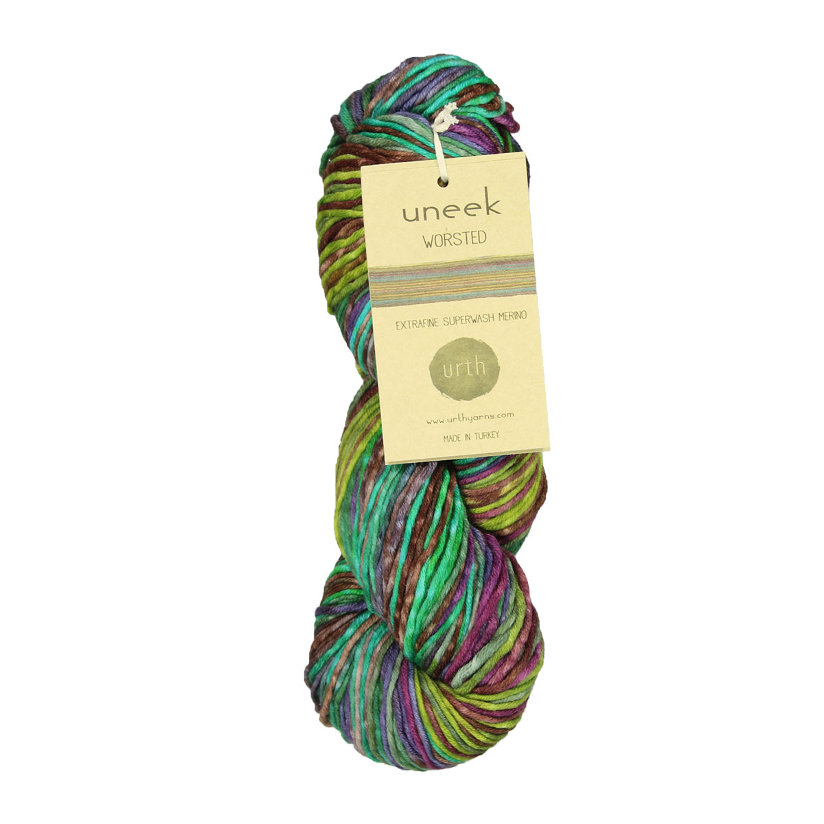 Urth Yarns Uneek Worsted is a self-striping, hand-dyed Superwash Merino wool available in rich and vibrant colors - each skein is truly a work of art to behold! Sweaters, shawls, accessories, and more will be taken to a new level with the beauty of this yarn! The striping effect is regular, but in a unique way that gives projects a very special look, because, in addition to striping, the colors also shade!