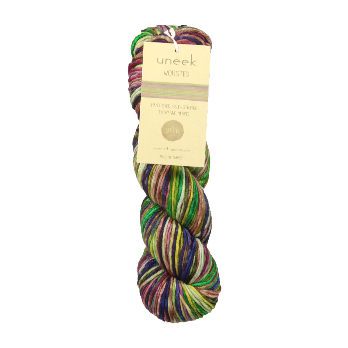 Urth Yarns Uneek Worsted is a self-striping, hand-dyed Superwash Merino wool available in rich and vibrant colors - each skein is truly a work of art to behold! Sweaters, shawls, accessories, and more will be taken to a new level with the beauty of this yarn! The striping effect is regular, but in a unique way that gives projects a very special look, because, in addition to striping, the colors also shade!