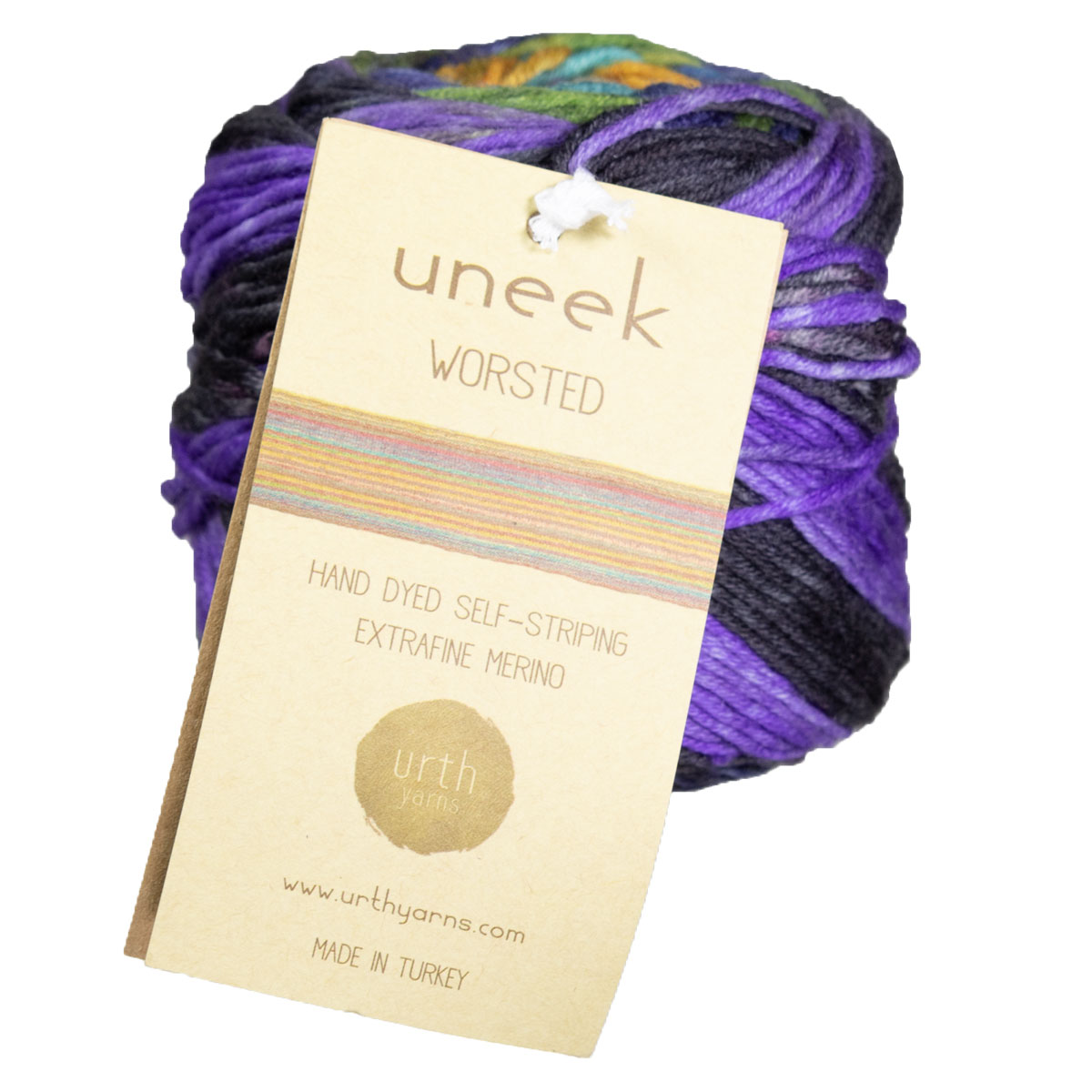 Urth Yarns Uneek Worsted is a self-striping, hand-dyed Superwash Merino wool available in rich and vibrant colors - each skein is truly a work of art to behold! Sweaters, shawls, accessories, and more will be taken to a new level with the beauty of this yarn! The striping effect is regular, but in a unique way that gives projects a very special look, because, in addition to striping, the colors also shade!