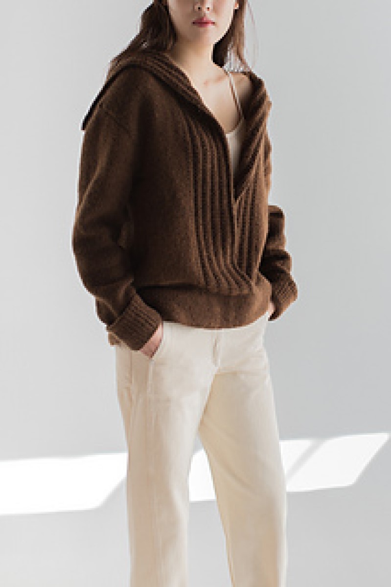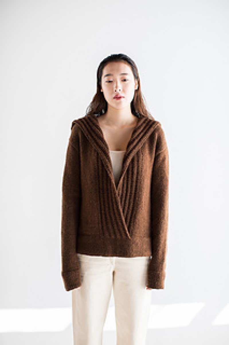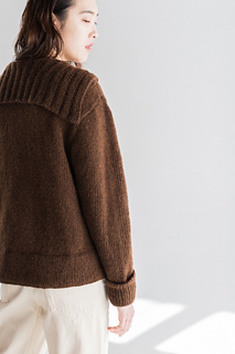 This is a stylish combination of cardigan and sweater, with a sailor collar in a moss rib stitch. The cuffs are in stockinette stitch and hemmed for good measure. The pieces are knit separately, joined with the three-needle bind-off at the shoulders and seamed on the side. Then provisional stitches are picked up for the bottom hem and knitted down. Choose the size with 6-10" of positive ease.